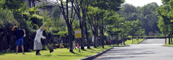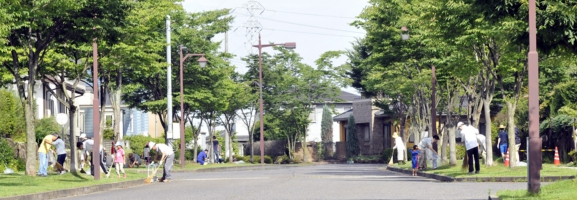 地区計画に定めるフレンドリーガーデン及び公共道路の植栽や芝生の手入れは、それらに隣接する区画の住人が維持管理をお願いしています。また自治会は保有する道具を貸し出し、自発的に関われるようにサポートしています。
