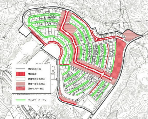 ・1区画230㎡以上の敷地面積、「ゆとりある美しい街並みづくり」を目指すために宅地の擁壁を道路境界から1m以上セットバックした部分に「フレンドリーガーデン」と呼ぶオープンスペースに各自が芝生、草木などを植栽する。」